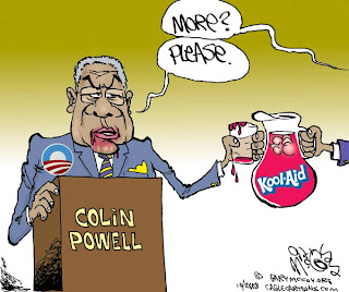 LMAO, I’m just waitin for the backlash from the black community “Why Powell gotta be drinkin Kool-Aid?”, “Why can’t he be drinkin what white people drink?' Personally I find this picture hilarious, because everyone (non-whites) knows that Grape flavor is black people's favorite. Maybe he is drinkin the Kool-Aid. Or maybe he still scathing from the Bush Administration. Either way, enjoy.