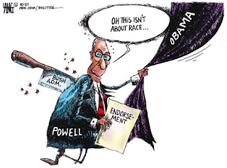 When I first saw this pic, I thought it was Powell being a back stabber for endorsing Obama. Silly me. Obviously if that were the case, it would show Powell stabbin someone in the back. I guess because Powell talked against the war in Iraq and the Bush administration made him a scapegoat (the black man always the scapegoat) by sayin he gave them faulty information, he decided to return the favor by voting for Obama. Clearly it isn’t about race, lol.